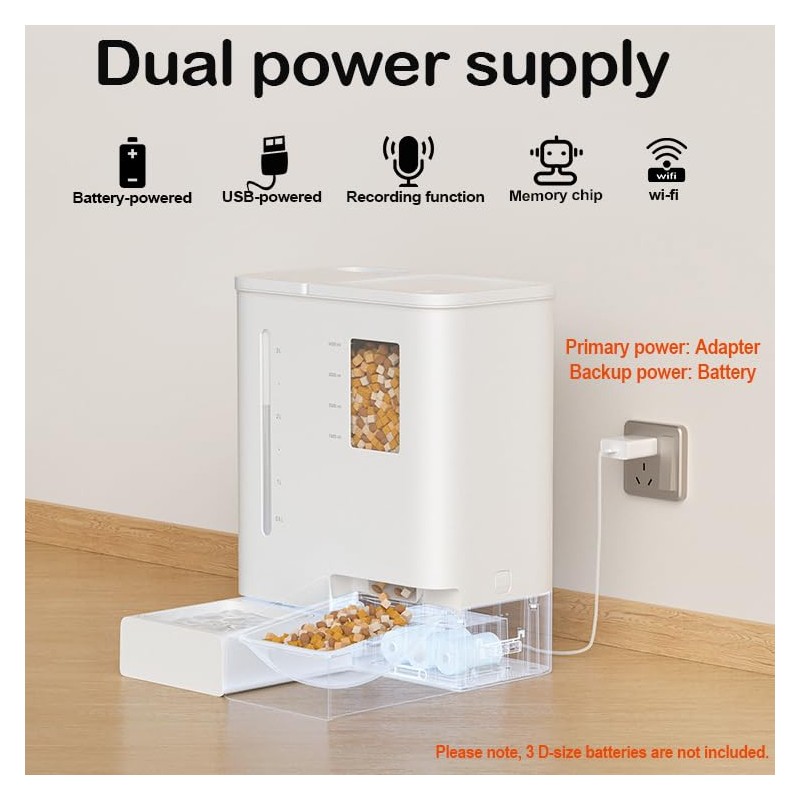 • Dual Power Backup: Supports both battery and adapter power options, with batteries lasting up to 180 days, ensuring pets are fed even during power outages or network disruptions.
