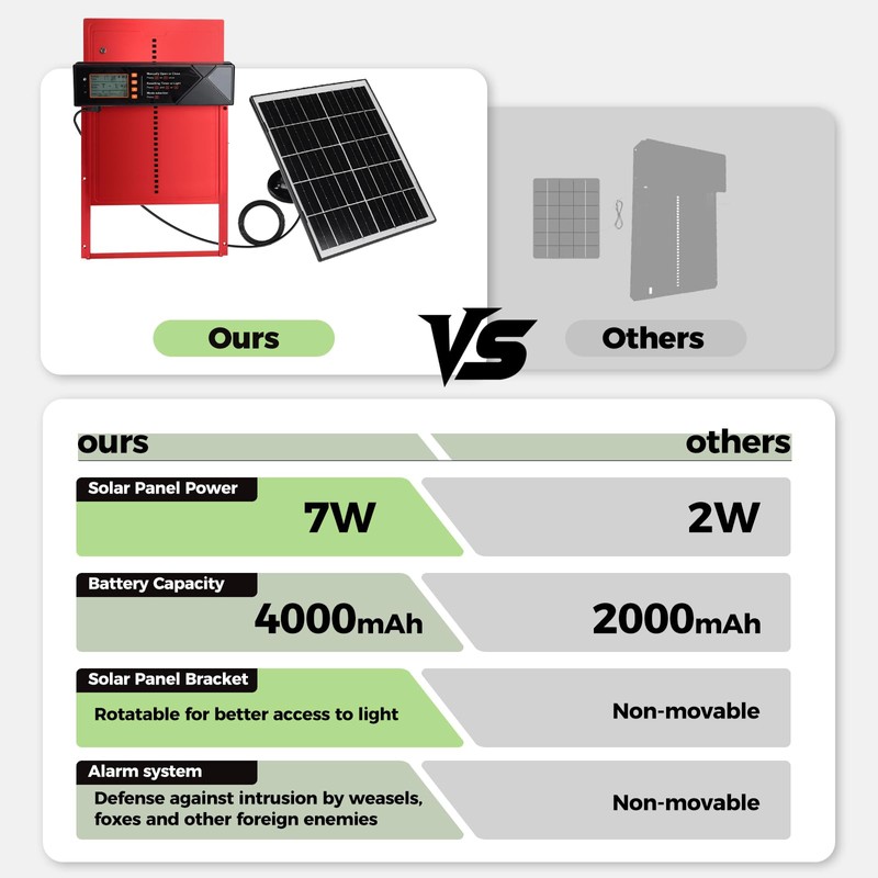 - 【High Power Solar Panels】: The Time Forest Solar Chicken Coop Door utilizes a larger area and stronger wattage 7W high power solar panel (most products on the market are 3.5W). The higher power can still remain rechargeable in low light or rainy weather, which is more efficient to ensure the normal operation of the automatic chicken coop door. Meanwhile, the included 9 ft charging cable allows you to place the solar panel anywhere more suitable for light according to the sunshine time.