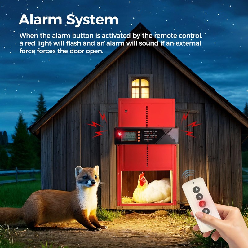 - 【Alarm System】: When the alarm button is activated by the remote control, the red light will flash and an alarm sound will be emitted if the coop door is forced open by an external force. This one can ward off the invasion of weasels, foxes and other species at night. Suitable for all types of poultry up to 10 pounds, such as chickens, ducks, geese, rabbits, etc.