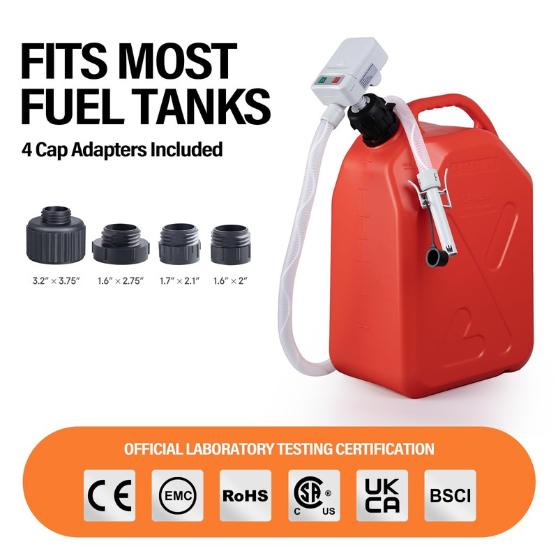 The pump comes with 4 adapters that allow you to screw it directly onto any standard gas can, ensuring a secure fit and avoiding spills. Its simple on/off operation makes it user-friendly, while the kink-proof hose guarantees smooth and uninterrupted fuel flow.