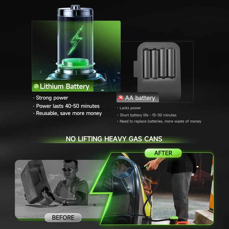 - ๐๐๐๐ ๐ฆ๐๐ก ๐๐ข๐ญ๐ก๐ข๐ฎ๐ฆ ๐๐๐ญ๐ญ๐๐ซ๐ฒ ๐๐จ๐ฐ๐๐ซ ๐๐ฎ๐ฉ๐ฉ๐ฅ๐ฒ - This lithium battery powered fuel transfer pump moves up to 3.2 gallons per minute. Gas can pump features a 17.7-inch intake hose and a 41-inch discharge hose. Max height of outlet 1.5 M/4.92 FT. Fully charged within 3 hours, can work for 45-60 minutes. 4*AA batteries can only work for 15-25 minutes