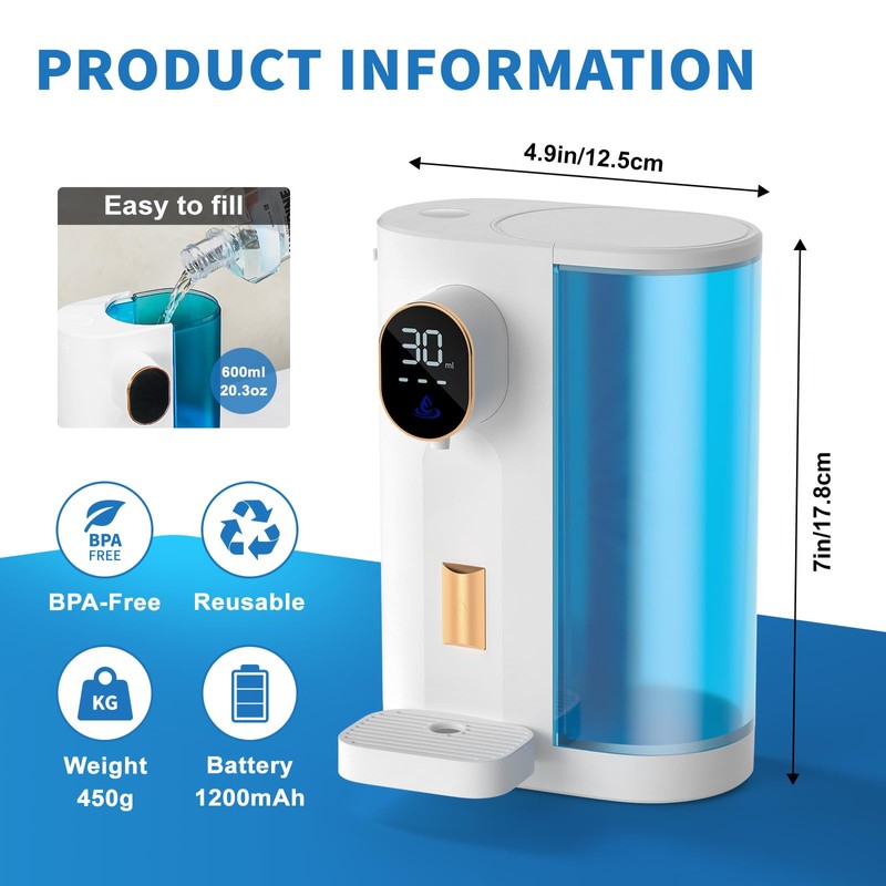 - 【UPGRADED DISPENSING SYSTEM & LED SCREEN DISPLAY】To avoid the issue of mis-sensing and no-sensing caused by other automatic sensing mouthwash dispensers, we upgraded the dispenser with one-click button. After setting the desired the level, slightly click the dispensing button with cup to start dispensing, It stops automatically when it's done. If you set unlimited level, hold the button to start, release the button to stop. It's more reliable, accurate and controllable. The Led -screen display of the dispensing volume and remaining power is clear at a glance.