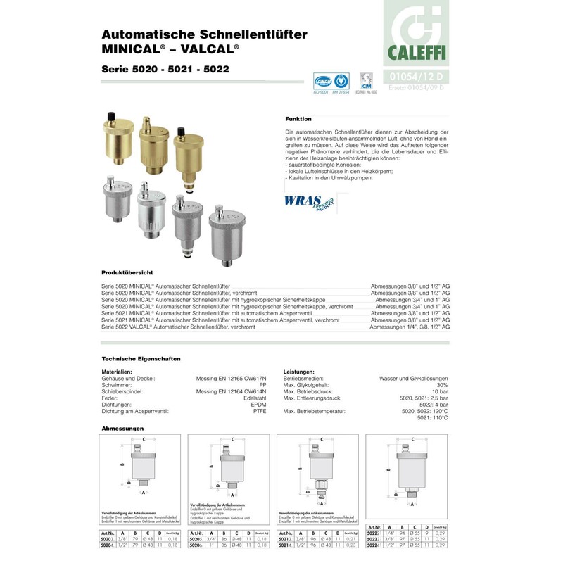 The accumulation of air bubbles in the body of the quick vent causes the float to sink and thus the opening of the valve. During the working process, the top cap must be loosened in the standard version and completely tightened when executing with hygroscopic cap.