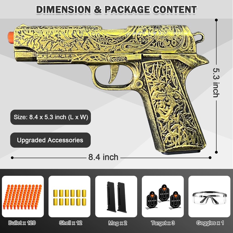 - PACKAGE CONTENT -- Our shell ejecting toy gun set comes with 120 x soft bullets, 12 x shells, 2 x mags, 3 x targets and 1 goggles. The toy gun with soft bullets is designed with beautiful retro pattern, providing a amazing shooting experience for both kids and adults