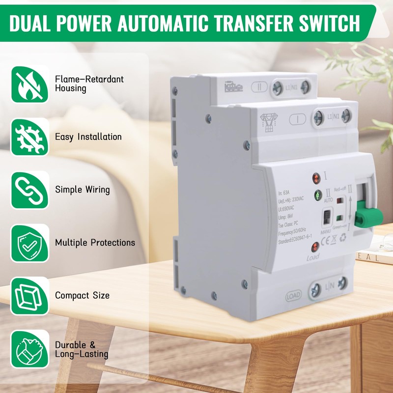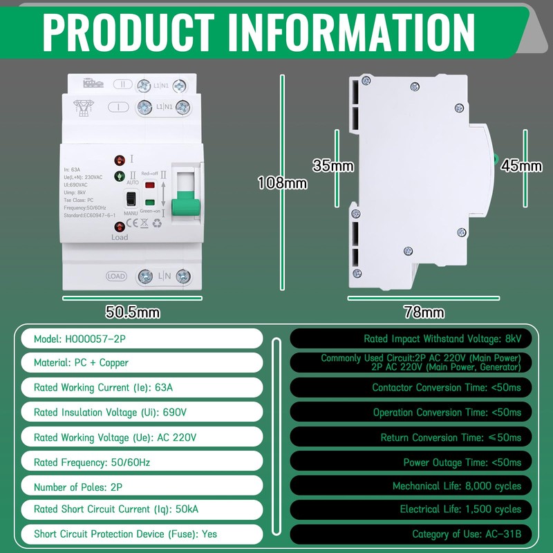 Automatic Transfer Switch, ATS 2P 63A 400V Transfer Switch DIN Rail ATS, Dual Power Switch DIN Rail, Electric Load Diverter for Three-Phase Power Supply