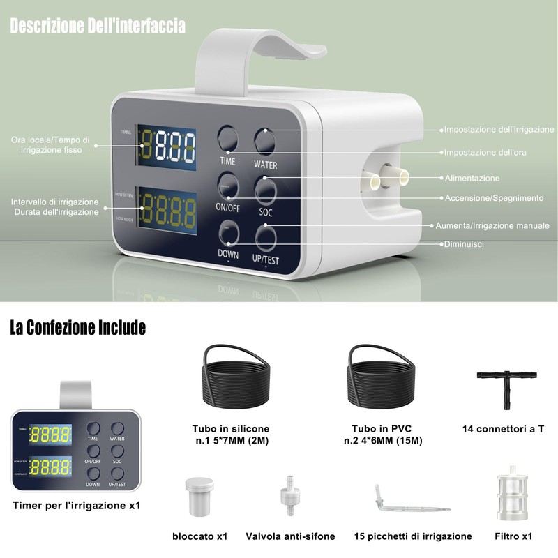 - Sparsam und effizient: Das Bewässerungssystem kann mit einem stündlichen Intervall (1 bis 15 Stunden) oder einem täglichen Intervall (1 bis 30 Tage) programmiert werden und die Bewässerungsdauer kann frei zwischen 1 und 300 Sekunden eingestellt werden. Es kann auch in den manuellen Modus gewechselt werden, ohne das eingerichtete Programm zu beeinträchtigen. Im Vergleich zur herkömmlichen Tropfbewässerung spart es Wasser, ist bequemer und geeigneter