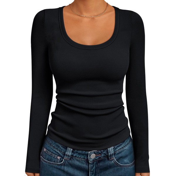 AUTOMET Womens Long Sleeve Shirts Ribbed Knit Tops Scoop Neck Fall Tops Black L