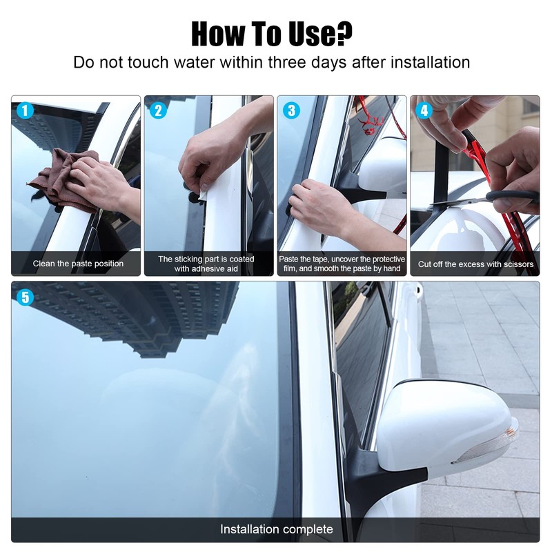 - ★ 【Easy Installation】: The window weather strip is designed with double-sided tape, which has good adhesion and can directly stick the tape on the car. Installation steps: 1. Wipe the place to be installed with a cloth; 2. After dry cleaning, remove the red film; 3. Press it on the installation position, and then cut the T-shaped rubber sealing belt