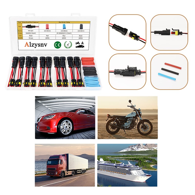 - Packing specification: 10 sets of 2 pin waterproof connector kit, 30 pcs red/blue/black heat shrink connector.