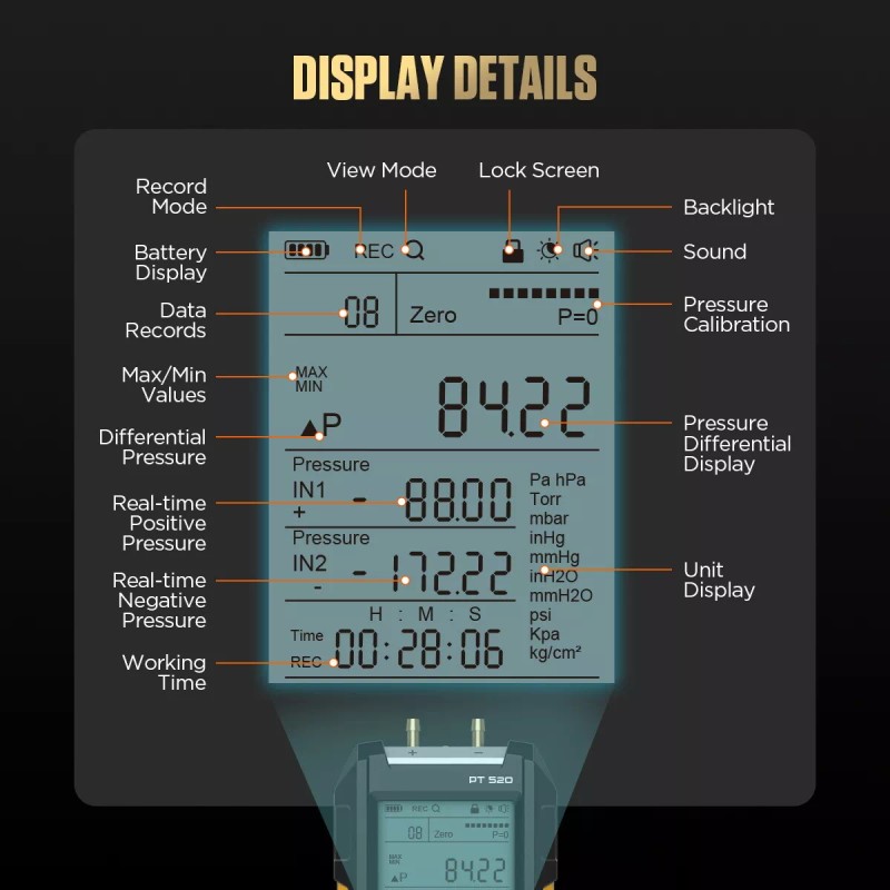 High-Precision Pressure Sensor It offers a broad measurement range, ensuring high accuracy and responsiveness in its measurements. | Data Locking and Storage Capable of locking data for easy on-site viewing, and storing data for later reference. | 10 Units of Measure Kpa, hPa, Torr, mbar, inHg, mmHg, inH2O, mmH2O, |