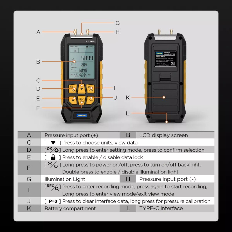 AUTOOL PT520 Digital Manometers can measure the air pressure of the single pipe, or differential pressure of two pipes. The high-resolution large screen of the digital manometer makes the data clear at a glance, and supports LCD backlight. It is widely used for gas measurement and calibration, gas pressure system troubleshooting, laboratory testing, maintenance and installation of blowers, clean rooms, boilers and other gas appliances. Features: -100~ 200Kpa Measurement Rnage Positive and negative Pressure Measurement Differential Pressure Measurement Max & Min Value Recording Supports 10 Pressure Units Stoarge Capacity for up to 29 sets High-resolution Backlight Display Automatic Power-off Data Locking and Rest Measurement Time Display Flashlight and Battery Level |