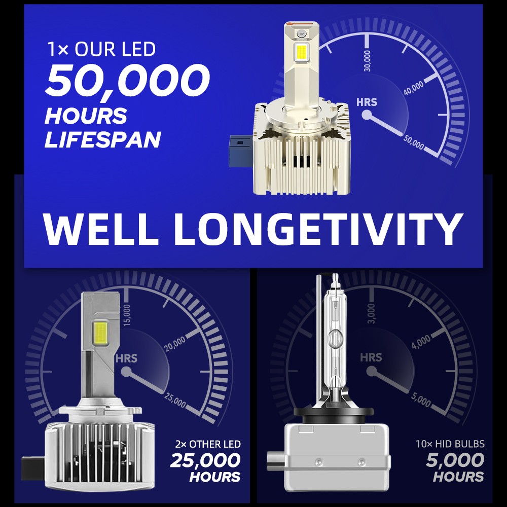 ??Super Long Lifespan??D1S headlight / fog light built in 12,000RPM high-speed cooling fan to provide super cooling ability, which ensures continuous lighting for more than 50000 hour.