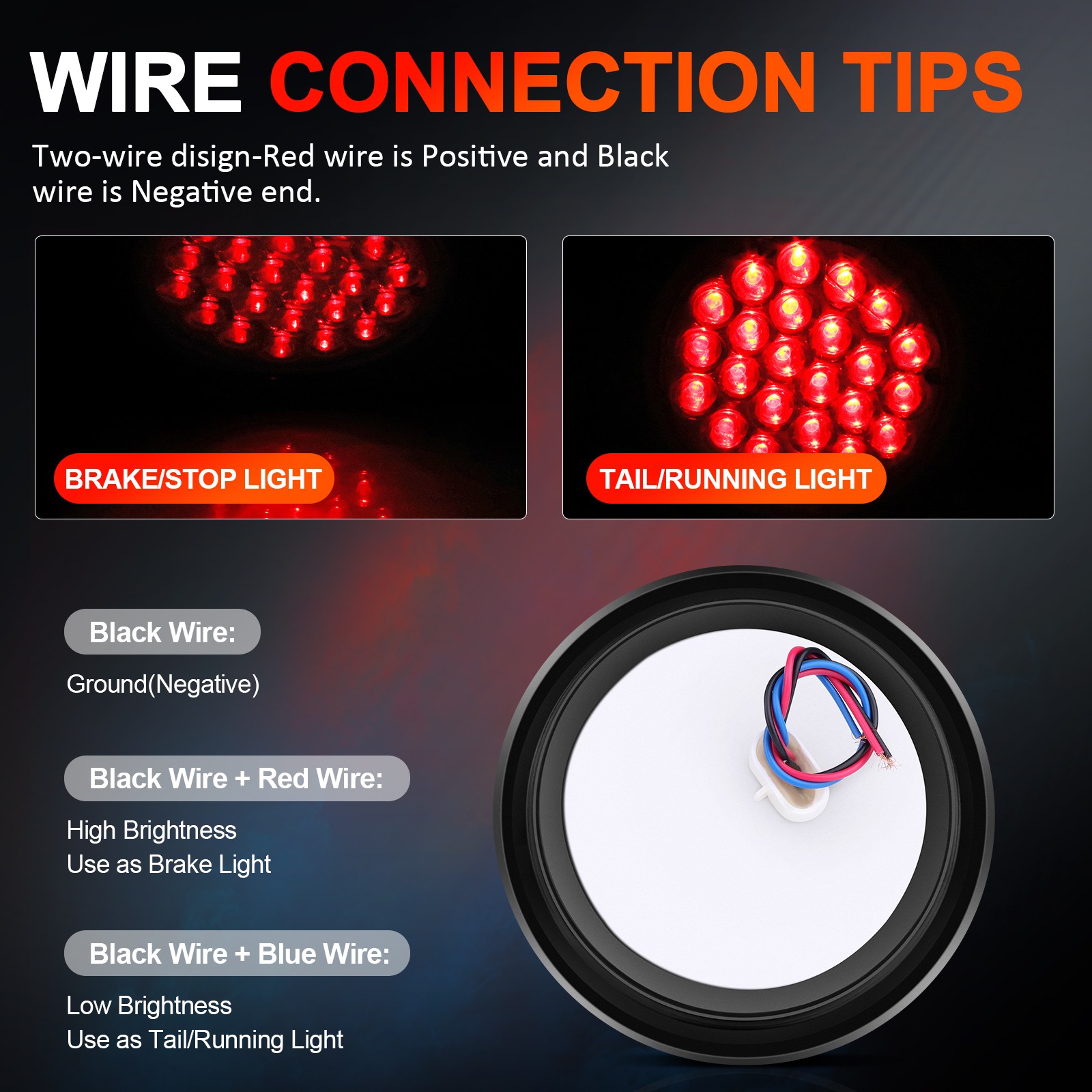 Wire Connection Tips: Black Wire is the Ground; Red Wire is the high brightness; White Wire is the low brightness
