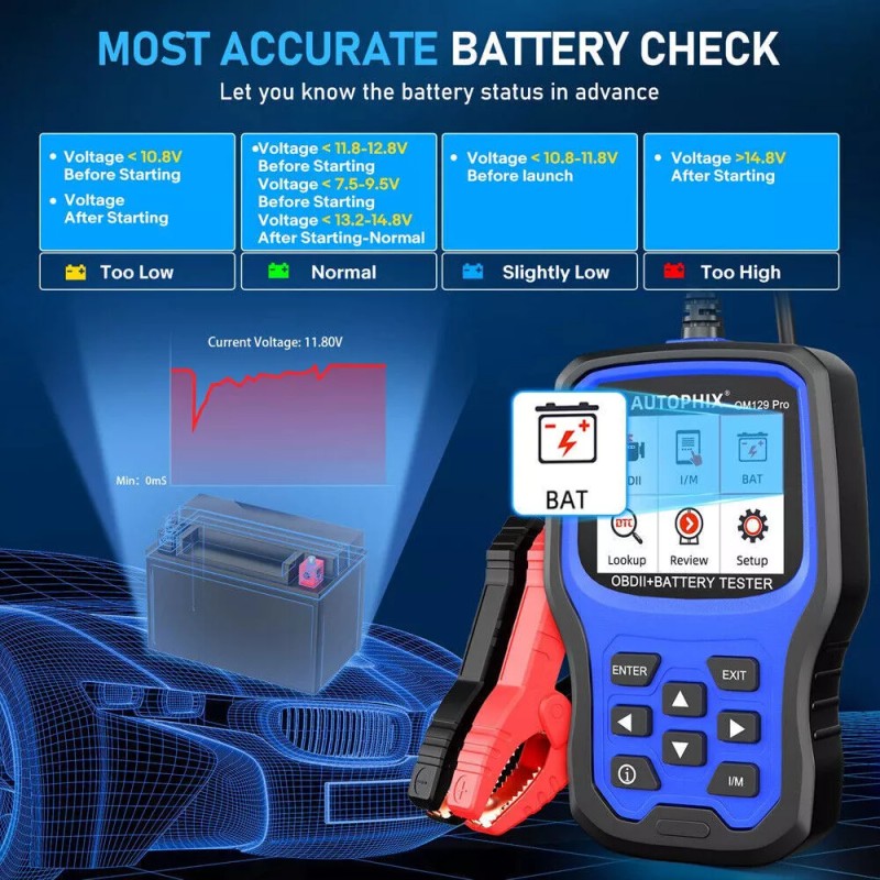 AUTOPHIX OM129 Pro 2 IN 1 OBD2 Scanner Code Reader Auto OBDII Diagnostic Tools 6/12V Car Battery Load Tester 100-2000 CCA Tool AUTOPHIX, as one of the industry's leading manufacturers and suppliers of professional automotive diagnostic tools, equipment and accessories, has been deeply engaged in this field for over 20 years and continues to innovate in order to provide better products to our customers. ![]() OM129 Pro Car Code Reader Powerful Features: ▪ 2 In 1 Most Comprehensive: Not only perform full OBDII functions, but also features 3 powerful battery test functions. ![]() Confused by the below situations? ![]() What's wrong with the car? ![]() 4 seconds rapid dagnostic ![]() Most accurate battery check ![]() AUTOPHIX OM129 Pro, the Best Doctor for Your Car Battery • Wide Battery Coverage: Works for all 6V and 12V lead acid batteries rated from 100 to 2000CCA, including Regular Flooded, AGM Flat Plate, AGM Spiral, GEL and EFB. ![]() 2022 Newest OBD2 Scanner with Full OBDII Test Modes • Read Codes/ Erase Codes: Locate which section of the emission control system has malfunctioned. erases the codes from the vehicle after certain repairs. ![]() ![]() Read & Earse Fault Codes ![]() Data Stream & EVAP system test ![]() Battery Test Functions BATTERY HEALTH TEST ![]() Test & analyze your 12V Battery ![]() Other Functions TURN OFF MIL ![]() Package include ![]() |