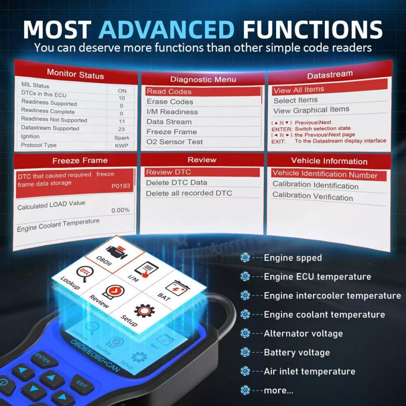 - Features: Backlit Display, Built-In Battery, Check Engine Light Shut Off, Erases Codes, Color Display, Freeze Frame Displays, Internet Updateable, LCD Display, Multi-Language Interface, User Friendly