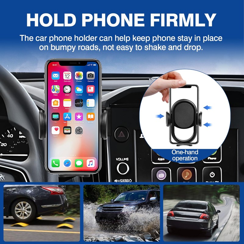 - Upgrade New Design---Different from ordinary cell phone holders, ours has an integrated design of the air outlet top and phone stand, which does not block the view. Besides, they can be held firmly in place, so you don't have to worry about your smartphone falling and getting damaged even when you're driving on uneven terrain