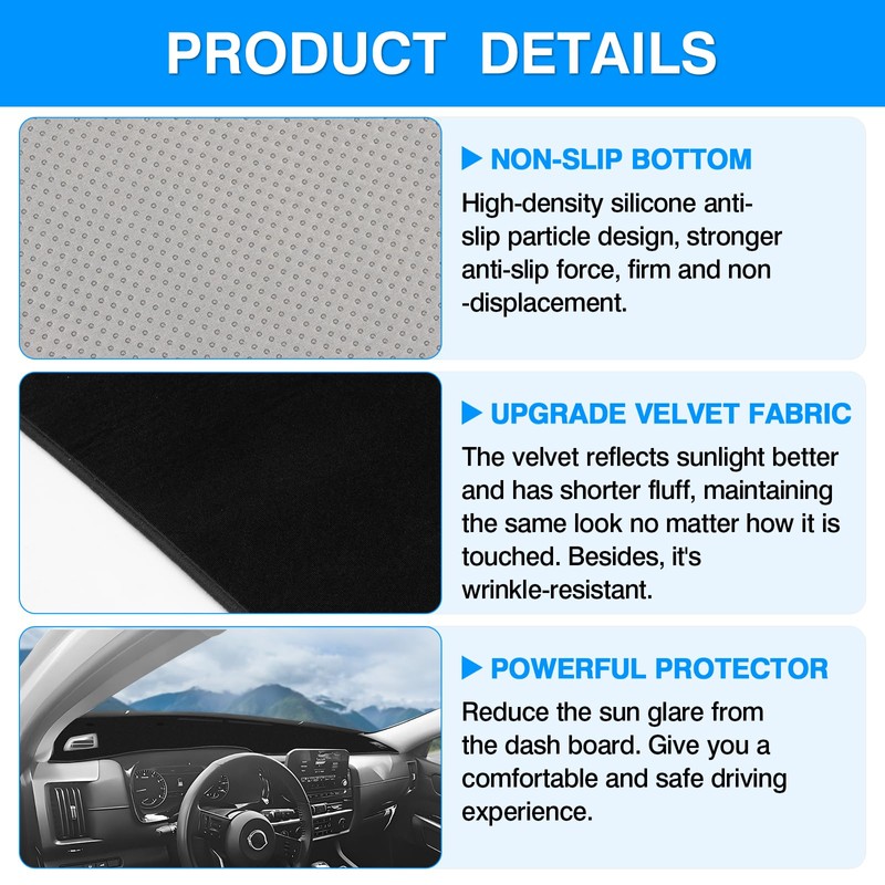 - Nonslip Design: Designed with densely silicone little dots on the back side, our dashboard mat features a nonslip that can better anti-slip, making it non-displacement.Well-made accessories for your dashboard