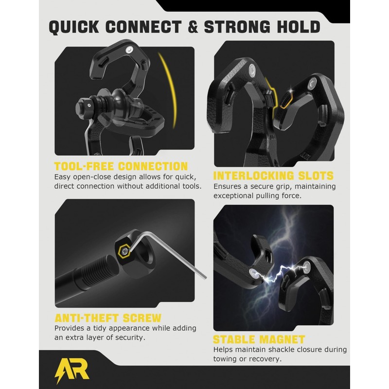 2-in-1 Snatch Block & Split Shackle Combo – The AUTORICH snatch block combines a heavy-duty pulley with our signature D-ring split shackle, creating a versatile recovery tool that functions as both a D-ring shackle and a snatch block. One compact unit, multiple uses — save space, reduce gear clutter, and handle more with less. Tool-Free Quick Connection – Unlike traditional snatch blocks that require separate shackles or hooks to attach, our split shackle design allows direct connection to tow straps, tree saver straps, or recovery ropes without additional hardware. Just snap it open, slide in your strap, and you're ready to go — perfect for fast-paced off-road or emergency recovery situations. High Load Capacity & Rugged Durability – This combo features a split shackle with interlocking slots and magnetic closure, paired with a high-performance pulley, supporting up to 10-ton (22,046 lbs) working load and 26-ton (57,320 lbs) break strength. Ideal for winching, towing, and directional pulls. The powder-coated and zinc-plated carbon steel ensures excellent resistance to rust, mud, and rough terrain. Universal Fit & Recovery Ready –AUTORICH 3/4” d ring shackle, combined with the 7/8 pin designed for compatibility with a wide range of vehicles and gear, including SUVs, trucks, ATVs, UTVs, and recovery straps. The included rubber spacers help minimize rattling and wear, providing a snug fit and smooth operation when used as a D-ring shackle. Note: Please remove the rubber washers before using in snatch block mode to ensure optimal pulley performance. Compact, Multi-Functional, Built for Action – Whether you’re off-roading, overlanding, or hauling gear, this integrated snatch block + split shackle is the all-in-one recovery solution you’ve been waiting for. Reliable, portable, and always ready when you need it most.
