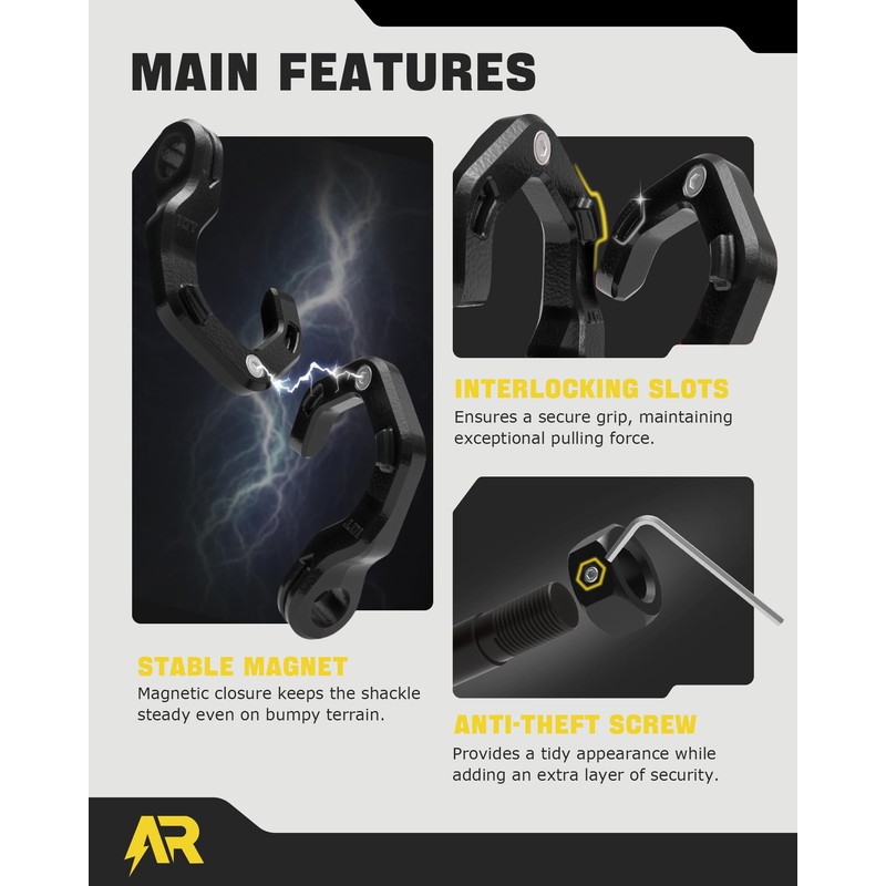 - Robust Design & High Strength: Engineered with interlocking slots, our tow shackles ensure a secure grip on both ends, delivering an impressive 10-ton (22046lbs) working load limit and a 26-ton (57320lbs) break strength [certified through rigorous strength testing]. Strong built-in magnets keep the shackles securely closed, reducing noise from vibrations, while small locking screws provide a tidy appearance and a degree of theft deterrence