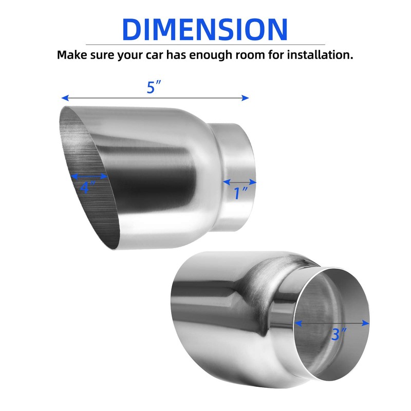 - Dimension: standard 3" x 4" x 5"(inlet, outlet and overall length); ONLY universal fit for vehicles with 3-inch outside diameter exhaust pipes (Please make sure the Outside Diameter of your vehicle tailpipe outlet is 3.0" before purchase)