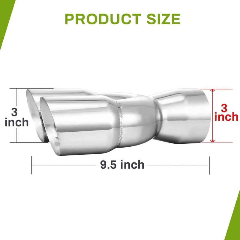 - Dimension: 3 inch inlet diameter; 3 inch outlet diameter; overall length:9.5 inch; universal fits 3" outside diameter of trucks car exhaust tailpipe (Note: please measure dimension to make sure it will fit before purchasing)
