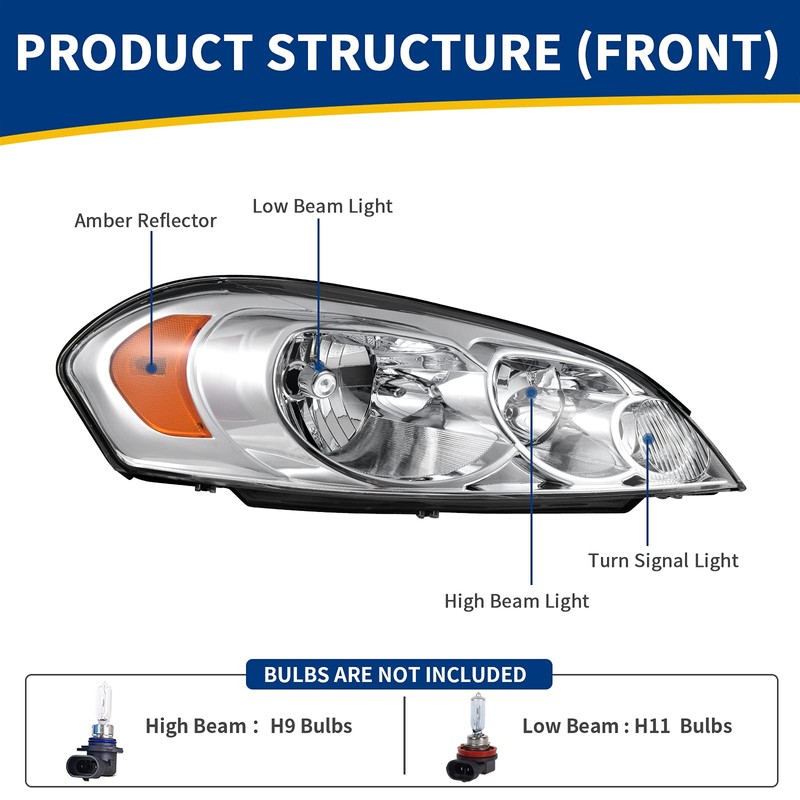 - Vehicle compatibility: headlights assembly compatible with 2006-2013 Chevrolet Impala / 2014-2016 Chevrolet Impala Limited / 2006 2007 Chevrolet Monte Carlo; high beam bulb type: H9; low beam bulb type: H11; bulbs are not included