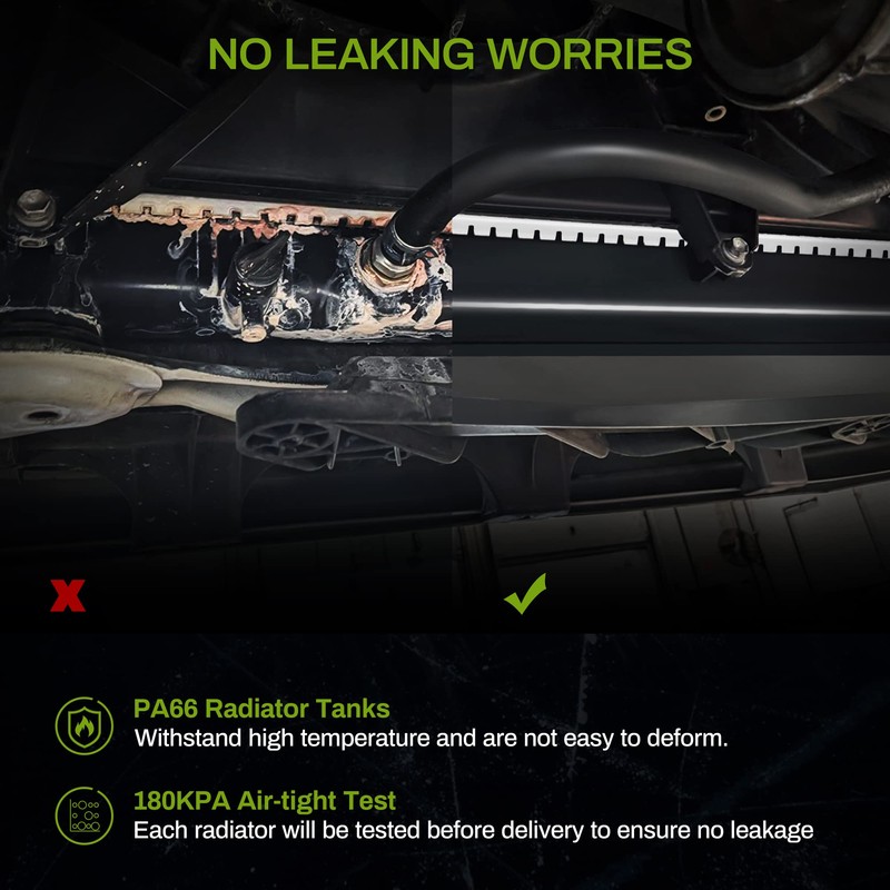 - LEAKPROOF MATERIAL: All products are subjected to leak tests, as the high-grade plastic tank & aluminum core are used in our radiators, which help ensure radiators' longevity