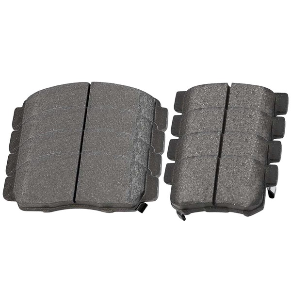 - Contains 8 front and rear, driver and passenger side ceramic brake pads. Ceramic brake pads produce less noise and dust than metallic pads. Shims reduce noise and vibration. Chamfered and slotted to prevent heat expansion cracks and reduced brake noise