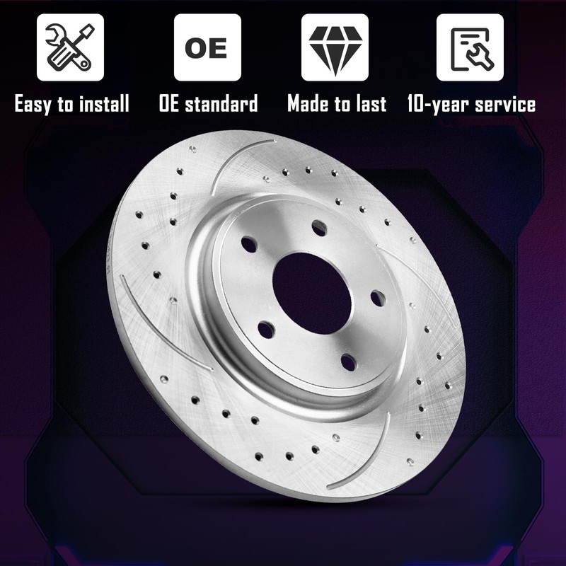 • Specifications: Position: Rear / Type: Solid / Drilled & Slotted: Yes / Rotors Material: Steel / Outside Dia: 11.99 in (304.7 mm) / Hub Holes Centering Dia: 2.52 in / Mounting Bolt Hole Quantity: 5 / Bolt Circle Dia: 4.5 in