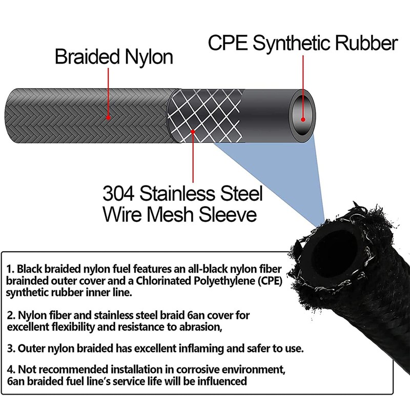 • Material: The oil hose is made of CPE rubber inner core, with a layer of 304 steel wire and nylon outer braid; the hose adapters are made of high-performance aluminum alloy.
