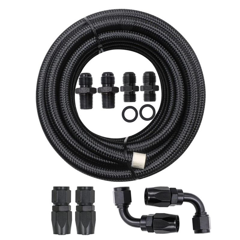 • Package included: 1x 15' FOOT OF PREMIUM -6 STEEL BLK BRAIDED HOSE 2x 6 AN STRAIGHT HOSE ENDS BLACK 2x 6 AN 90 degree HOSE ENDS BLACK 2x BLACK 1/4"NPSM X -6 TRANSMISSION FITTINGS(the short ones with the o ring) 2x BLACK 1/4"NPT x -6 RADIATOR FITTINGS as picture show(the long ones without the o ring)