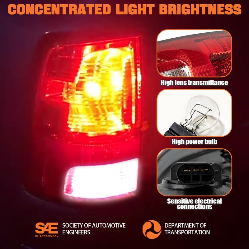 - Recommended Replacement:Over time, the taillight lens will eventually crack due to collision, thermal deformation or wear, the bulb will burn out due to filament breakage or vibration, and the wires will fail due to short-circuiting, disconnection, or poor contact, at this time, the taillight will not be able to play the role of signaling, which is very dangerous, and it is recommended that you replace it in a timely manner. This tail light assembly manufactured using rigorous processes in accordance with DOT and SAE standards, with quality and fitment meeting or exceeding the standards for aftermarket replacements, so you can buy with confidence.
