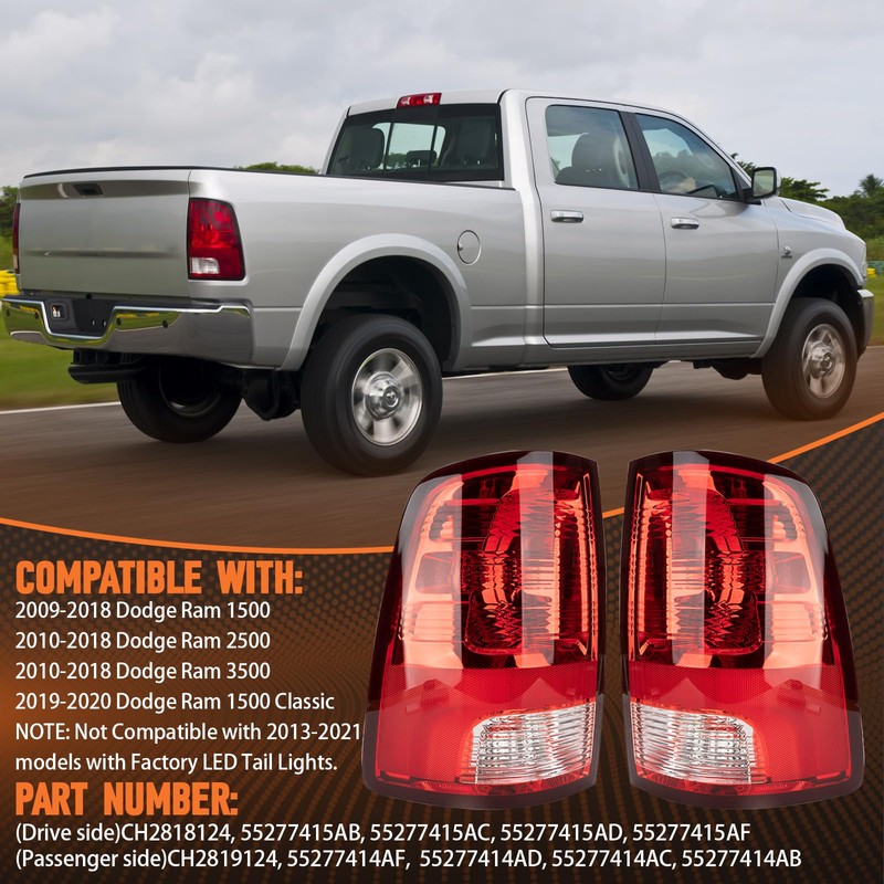 Compatible With 2009-2018 Dodge Ram 1500 2010-2018 Dodge Ram 2500 2010-2018 Dodge Ram 3500 2019-2020 Dodge Ram 1500 ClassicNOTE: Not fit for 2013-2021 Factory LED Tail Lights.Note: Please check the part number before buying to make sure it fits your carWhy Should You Choose Us?Quality ManufacturingAutoverve has strict manufacturing and inspection processes, focusing on providing cost-effective and high-quality brand new products, hoping to bring you a good shopping experience!After-sales supportWe will always stand on the side of our products to protect your rights first. If there is any quality problem, you can contact us at any time, we will solve the problem with you within 24 hours!