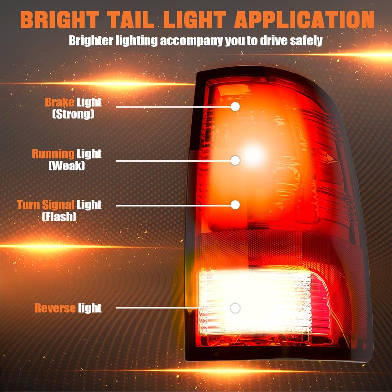 - Quality Manufacturing: Made of reinforced high-quality materials, wear-resistant, corrosion-resistant, long service life. Stable chemical structure, not easy to aging and change, while protecting the whole tail light part. The lens material is crystal clear, with a light transmission rate of 92% or higher, allowing for a more focused, even light from the taillights. Bright bulbs with high power and visibility of up to 900 feet clearly communicate the operating status of the vehicle to the vehicle behind, providing effective support for your driving journey!