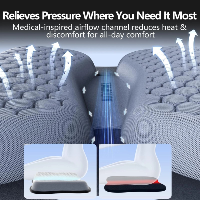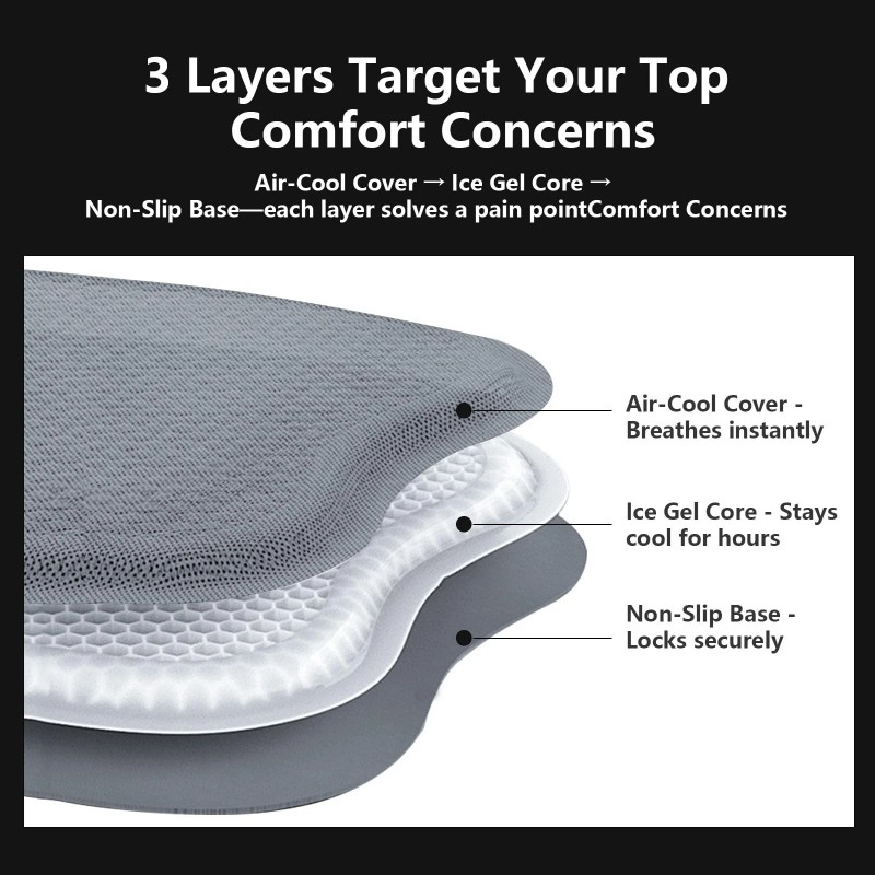 Dual-layer sciatica pain relief cushion adapts to car/office/sofa. Ice silk mimics cryotherapy coolness, ergonomic gel cradles coccyx. 1-year warranty.