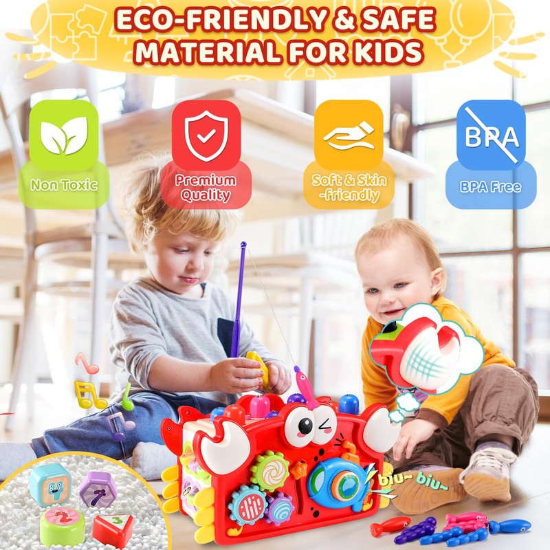 - 15-in-1 Montessori Learning Crab --- The activity cube is packed with 15 interactive play features across 6 sides. From fishing games to shape sorting, rhythmic lights, clock and number challenges, spinning gears, flipping and guessing, sliding training, soft-touch surfaces, whack-a-mole, tunes, hand drums, bead threading, piano keyboard, submarine adventures, and Biu Biu button sounds, the versatile crab offers endless exploration and educational enlightenment for babies.