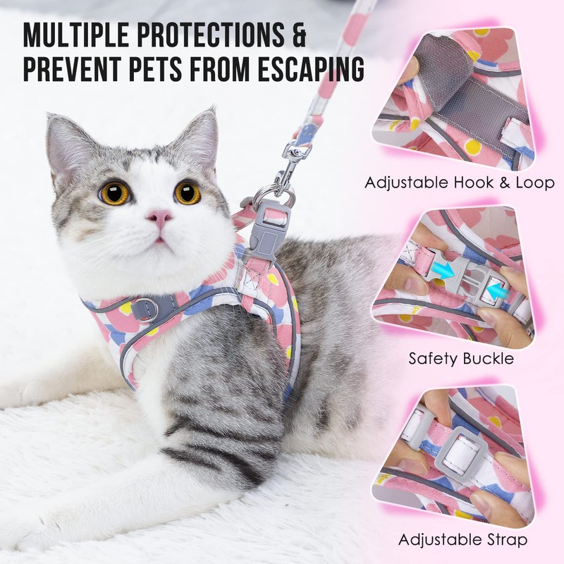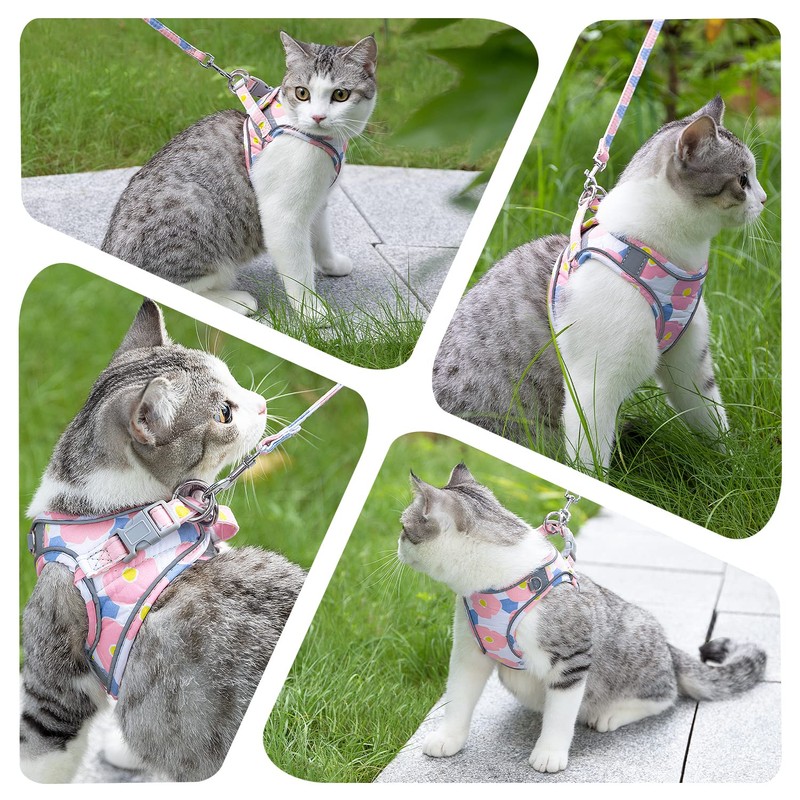 - Cute & Comfortable --- Made of lightweight and breathable fabric, the cat walking harness brings less stress to a reluctant cat. The non-stick fur lining won't cause skin problems, and the cute floral pattern on it makes your feline pal even more adorable. A small ring in the front of the kitten harness can attach a cat bell or a tag to add cute features.