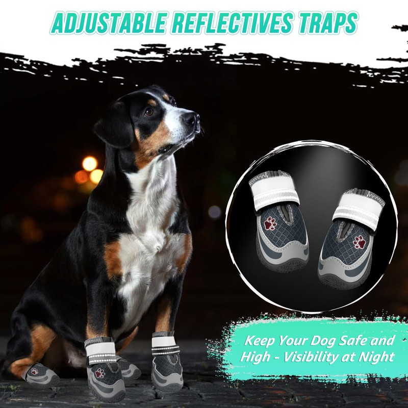 AUTOWT Dog Boots, 2 PCS Breathable Dog Paw Protector, Dual Adjustable & Washable Non-Slip Dog Shoes with Reflective Strip for Injured Paws, Comfortable Dog Walking Boots (Dark Grey, 7)