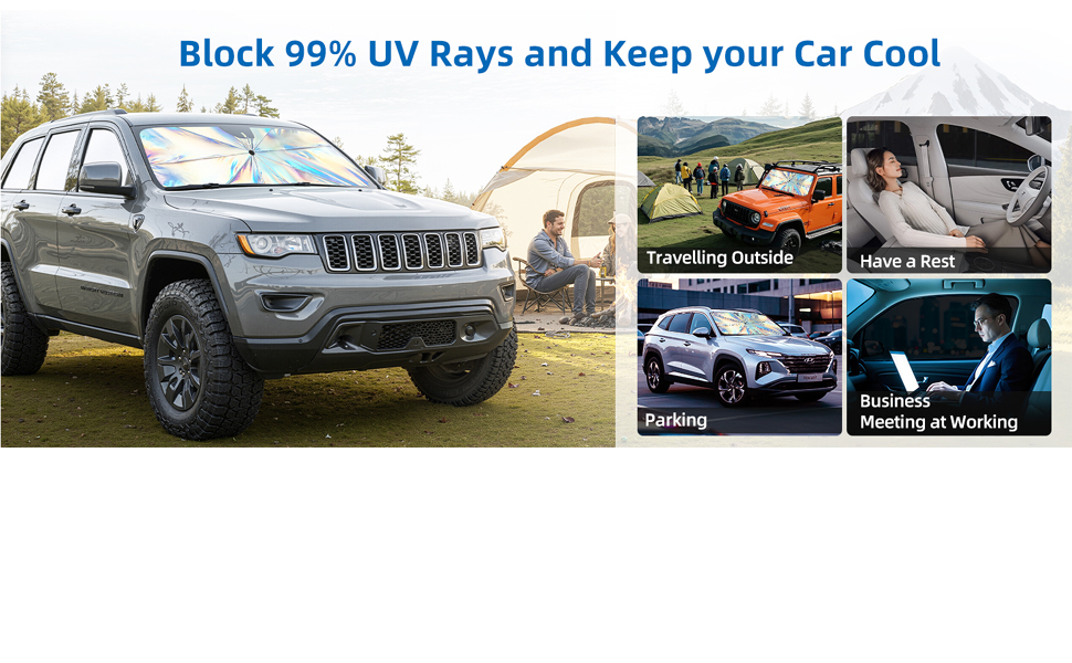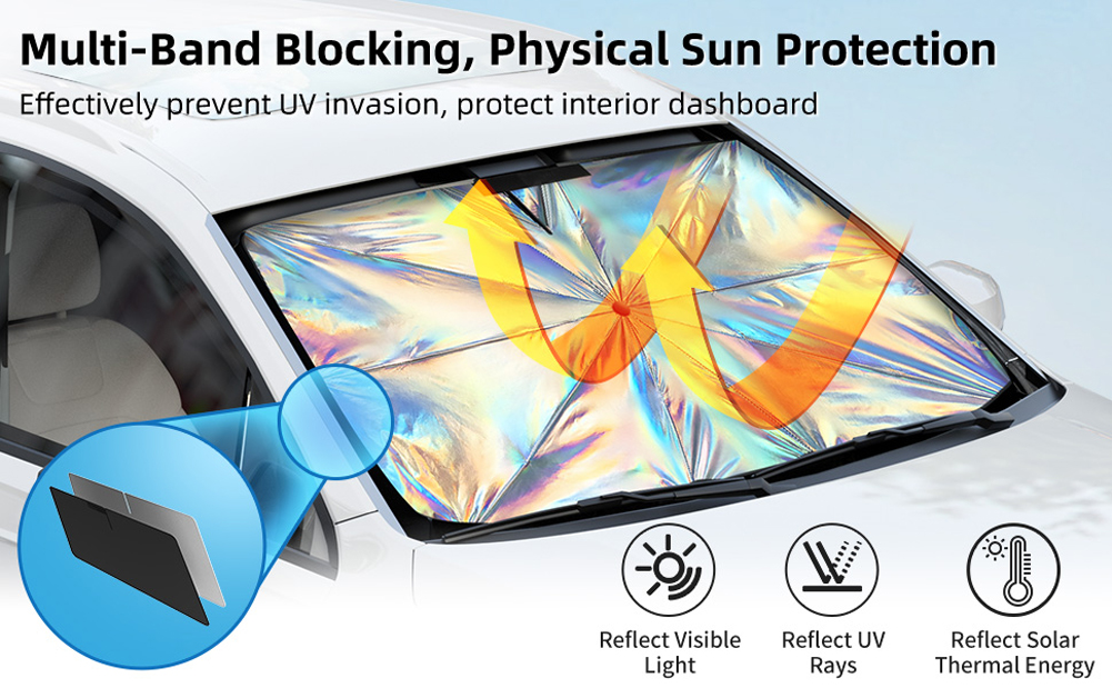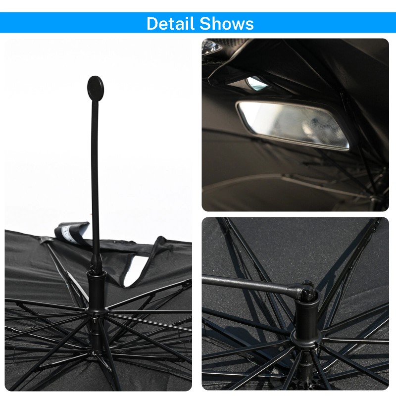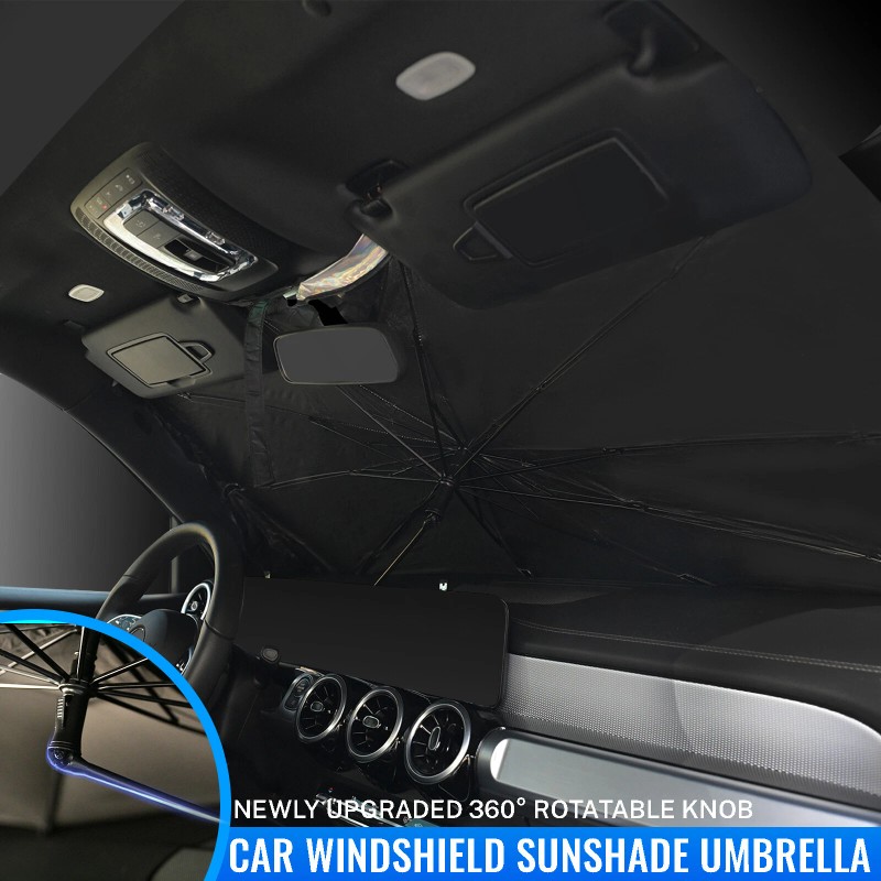 1. High-Quality Material & Durable Design - This 2025 latest umbrella is made of LAZER EFFECT silver coated fabric and black steel bone. These types of materials ensure the reliability and durability of this car sunshade umbrella. Its design - the silver coating and black back can efficiently protect the interior of your car from UV rays, sun glare, to lower the temperature in the car, which makes you comfortable.3. Certain Upgraded Designs For The Umbrella - First, a slot is designed on the upper side of the umbrella. With this slot, it can perfectly fit for the windshields or windscreens with rear view mirrors. Second, the unique idea - 360 degrees rotatable and bendable umbrella knob - is taken. The umbrella knobs of most of car sun umbrellas can't be rotated at 360 degrees and bendable. However, the umbrella knob of our car sun umbrella is made from soft plastic and can be 360 degrees rotatable and bendable, which better protect your car center console and dashboard from being scratched.