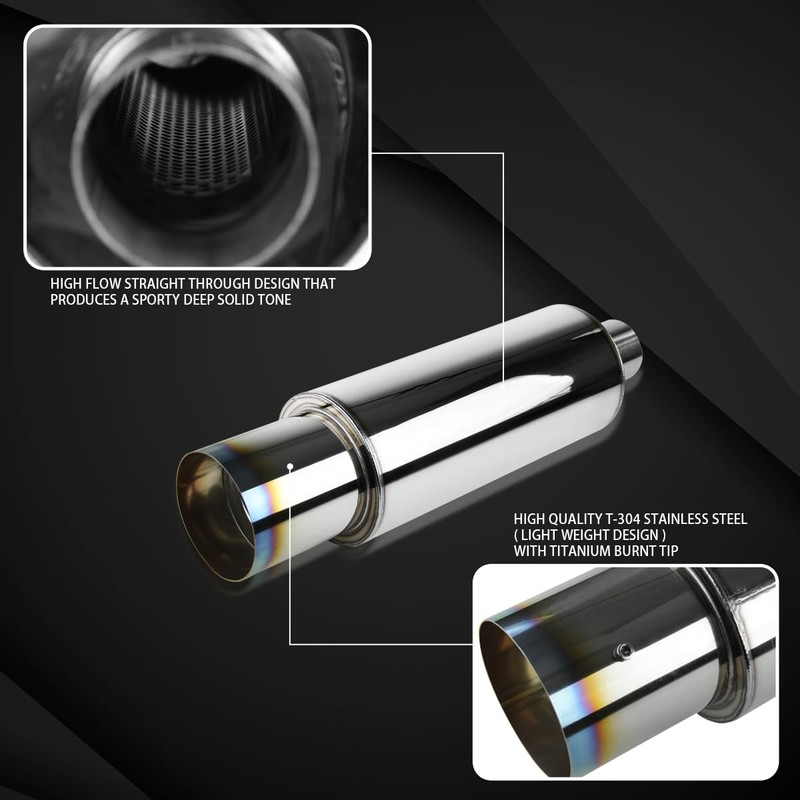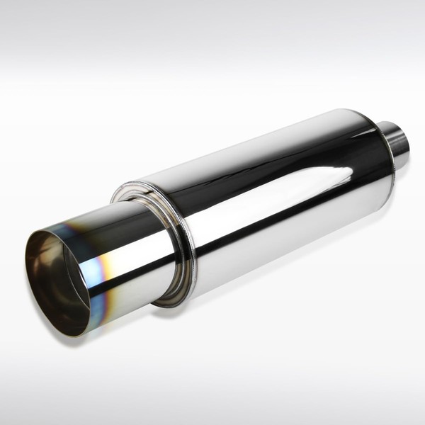 Brand New In Original Packaging. Exactly The Same As Shown In The Picture! Straight Exit Design Muffler. Made Of High Quality T-304 Stainless Steel ( Light Weight ) With Titanium Burnt Tip. Size 18.5"Length X 5" Diameter. Outlet Tip: 4" Inlet Tip: 2.5" ( Diameter ). Outlet Tip Length: 4" Inlet Tip Length: 2.5". Increase 5-10 Horsepower. Offers A Greater Flow & Higher Power Gain Due To The Less Restrictive Design. Allows Greater Exhaust Velocity For Better Mid-Range Boost Response & High Power. Benefit From Greater Exhaust Flow Capacity As Engine Tuning Levels Increase.