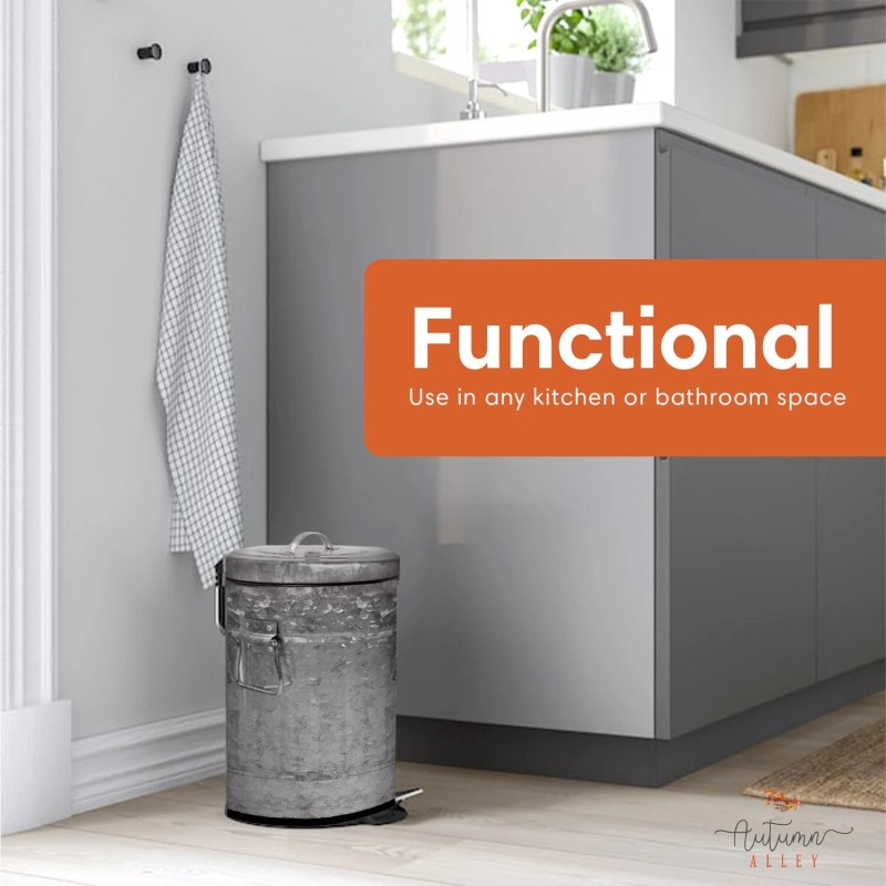 - Durable, Well-design and Functional - Autumn Alley's farmhouse galvanized trash can with lid and pedal is long-lasting and well-designed with strong steel, easy to clean, and keeps stinky trash out of sight and mind plus this trash can has multiple features that easy to use and transport