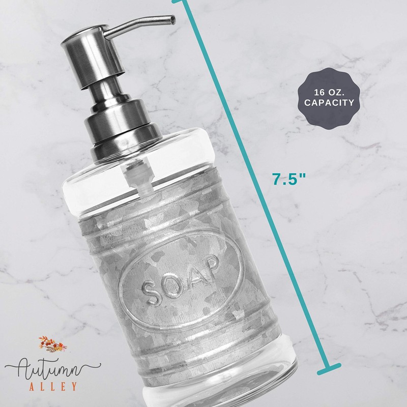 Autumn Alley Glass & Galvanized Soap Dispenser Set for Hand Wash, Sanitizer, Lotion, Dish Soap – Rust-Proof Liquid Soap Container with Pump for Kitchen/Bathroom – Charming Farmhouse Label Design