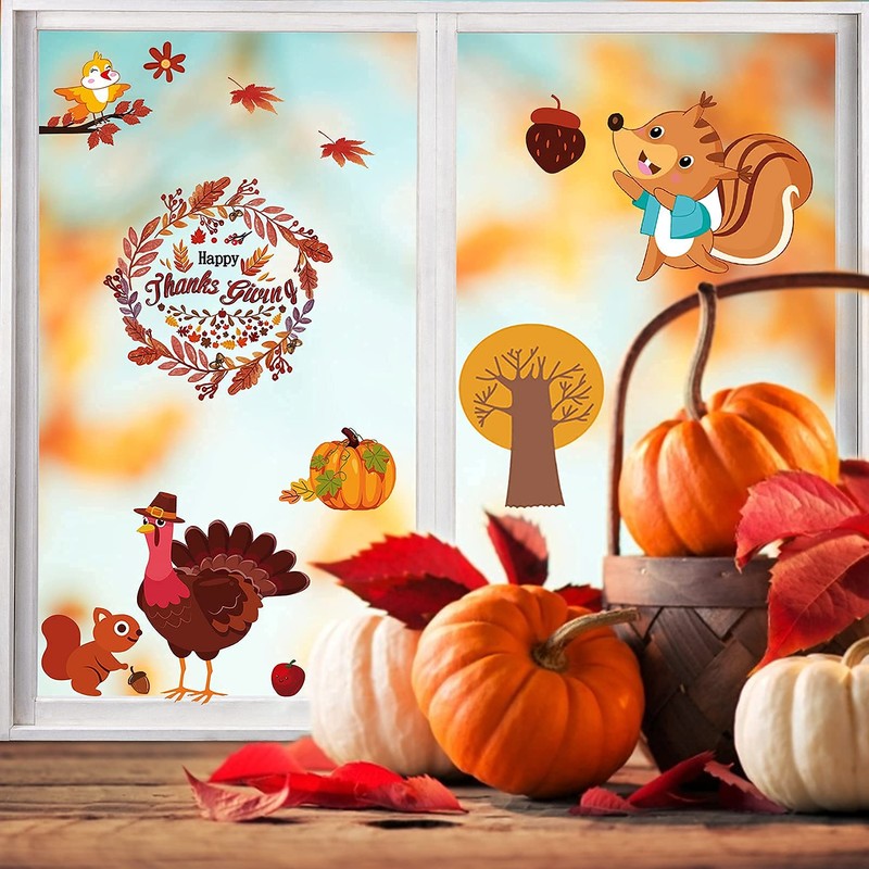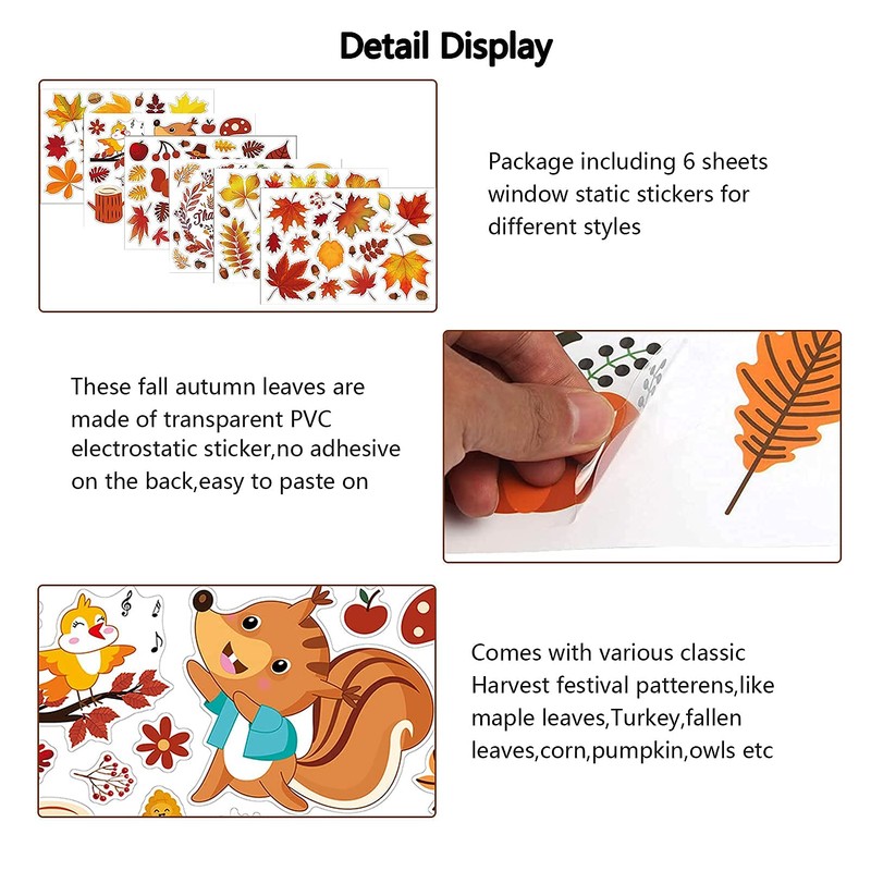 - Versatile: the Thanksgiving stickers do not stick to the windows and the autumn decoration can be pasted anywhere you like. Maple leaf window stickers are perfect for decorating kitchen, mirror, refrigerator, wall, bathroom, party decoration, cafe decoration, bookstore decoration, etc. Make sure the surface you stick to is smooth and clean before using it.