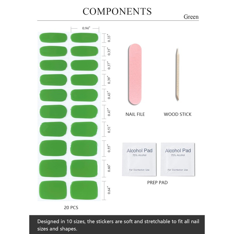 - 【Complete Set of Nail Art Stickers】- Each box includes 20 easy to use semi cured gel nail wrap in 10 different sizes. It also comes with 2 prep pads, 1 nail file, and 1 wooden stick.
