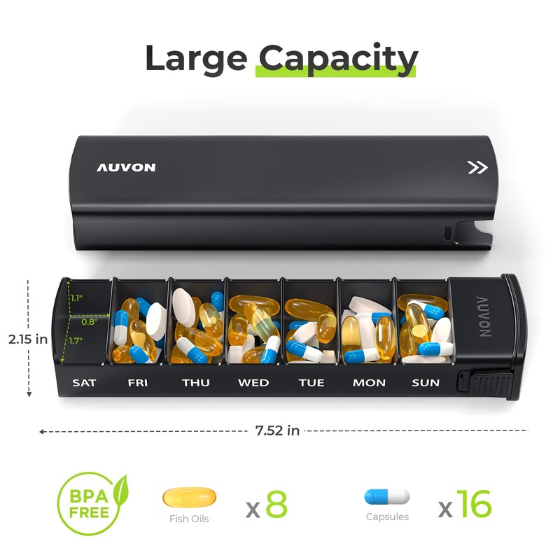- Organize Your Pills in Style. With AUVON Aluminum Alloy weekly pill organiser, you can forget about flimsy plastic and pill spills. Our aluminum alloy shell is sturdy yet lightweight, and the inner pill tray is made of food-grade, BPA-free material. And the stylish design also doesn't make people realize that this is a medication organizer. Keep your medication secure and private in a cool way!