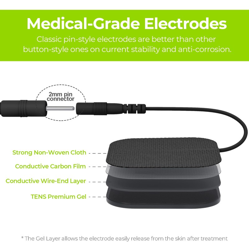 - Universal Compatibility. Standard 2mm connector electrodes pads are classic and commonly used in medical area, which makes it easier for you to find compatible TENS unit muscle stimulator & accessories.