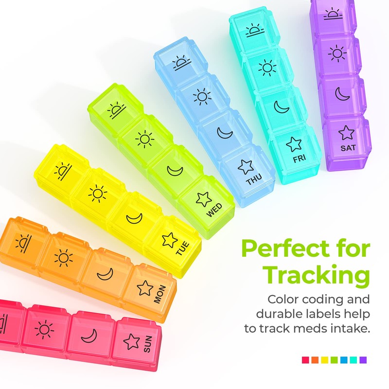- Store a Week's Worth of Meds. The color-coding pill holder helps you track your daily pills, and the detachable design allows for easy grab-and-go use. (Compartment Size: 0.9” x 1.1” x 0.9”)