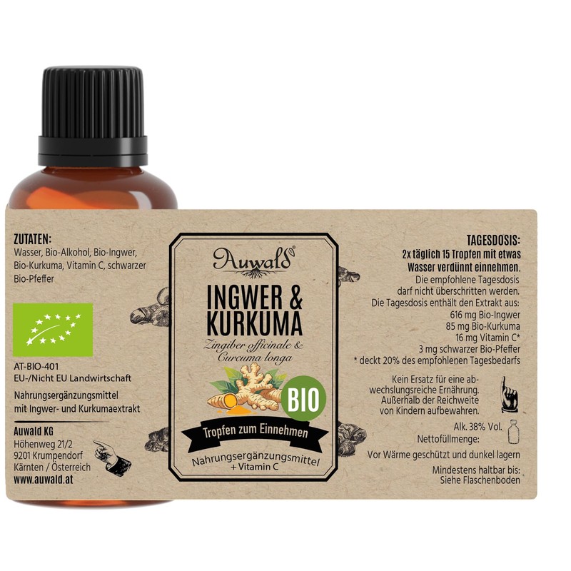 Auwald NEU! Auwald Ingwer & Kurkuma Tropfen BIO ?C Hochwertiger Auszug, Extrakt, Essenz & Tinktur ?C 100% BIO Landwirtschaft, Frei von k??nstlichen Zus?tzen und Farbstoffen, Hergestellt in ?sterreich ?C 100ml