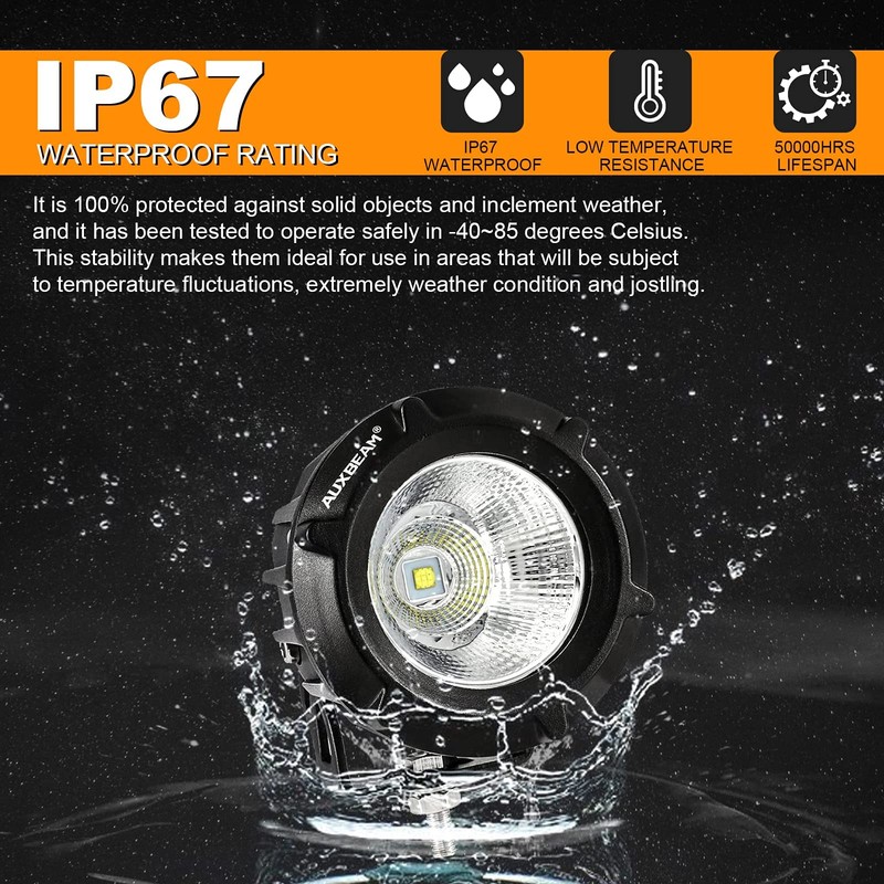 - 【WATERPROOF IP67】 IP67 waterproof rating and low power consumption design with integral heat sink to keep the working temperature down and allow the LED's to run cooler. Effectively extend the round led offroad lights lifespan of more than 50,000 hours