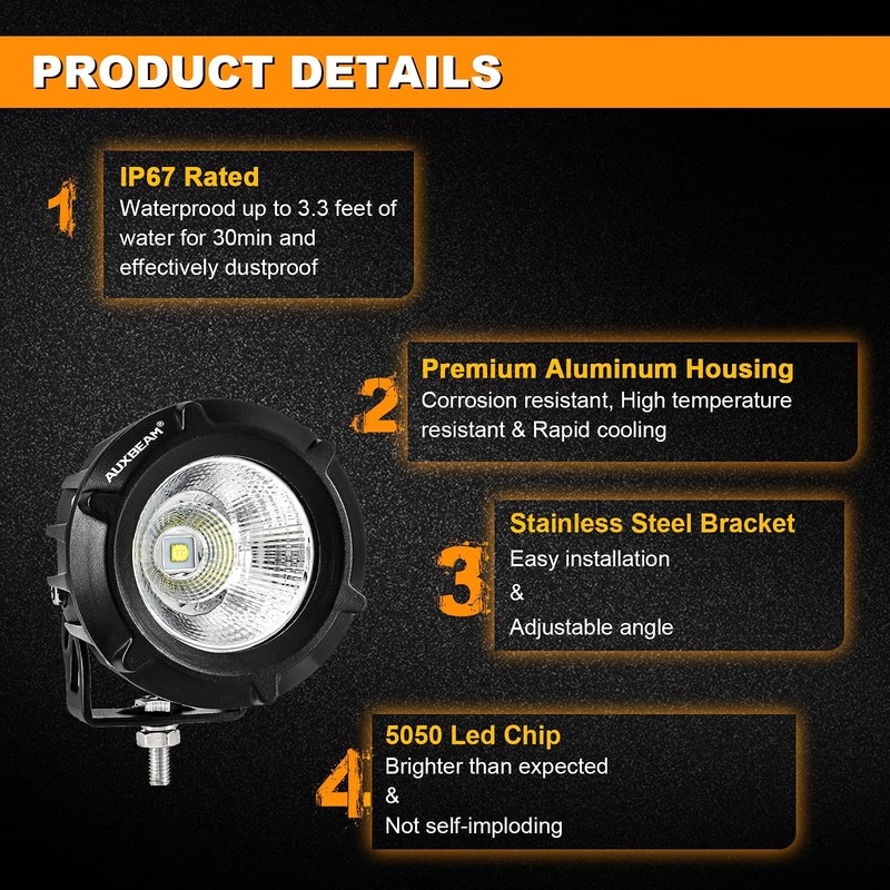 - 【APPLICATION】Auxbeam 3.5inch motorcycle driving fog lights come with necessary accessories for easy installation, adjustable bracket makes changing direction of the white light beam easily. Great for any kind of motorcycle, Off Road Vehicles, ATVs, UTVs, SUVs, Construction Vehicles, Farm Vehicles, Trucks, Motorcycles, Buses, Boats, etc